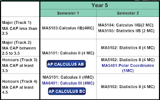 A more likely situation is that a student who qualifies for Track 3 chooses not to take math honours instead and decides to ‘downgrade’ to Track 2. This is what I did. On the other hand, if you only qualified for Track 2 in Year 4, you could ‘upgrade’ to Track 3 by scoring a Year 5 math CAP and at least a 4 in your AP Calculus AB. But to my knowledge no one has done that either.